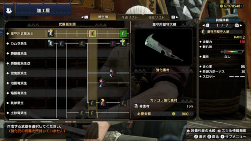 さらに里守武器は強化することもできるので、自分のレベルや、狩りに行くモンスターの強さによって変えることもできます。