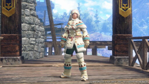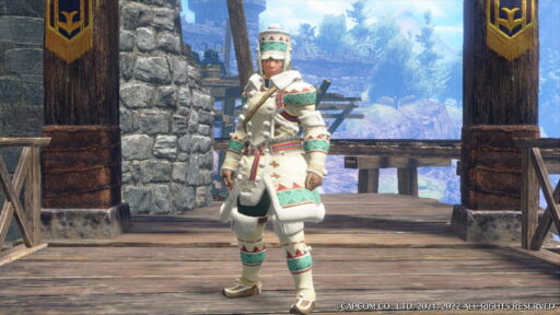 氷原に溶け込む純白の毛皮とエスニックな意匠のコントラストが美しい頭用装備