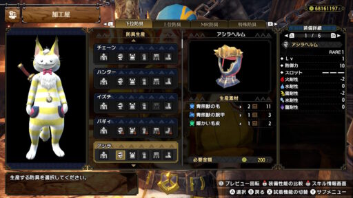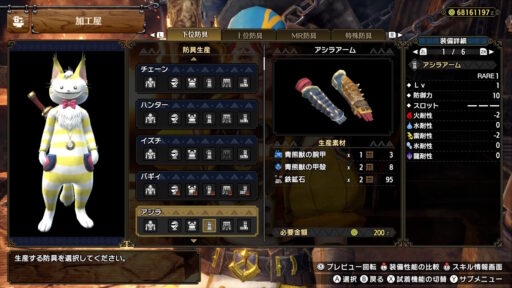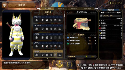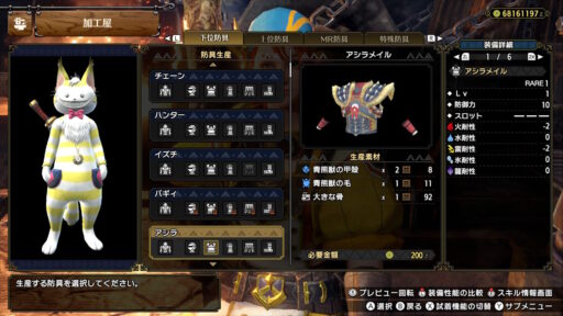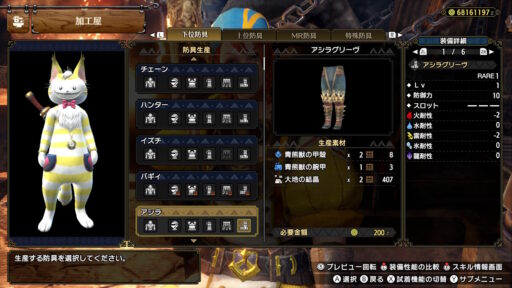 こんな感じですね!マスターランク装備では防御というスキルがアオアシラフル装備でマックスの7まで付きます!