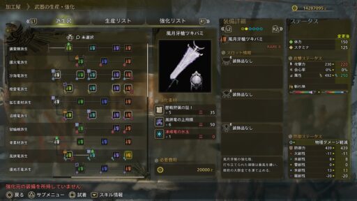こんな感じです!防具説明をみると、かなり軽くうごきやすい防具のイメージがつきますね!軽いおかげか、この防具には回避性能というスキルがついています!